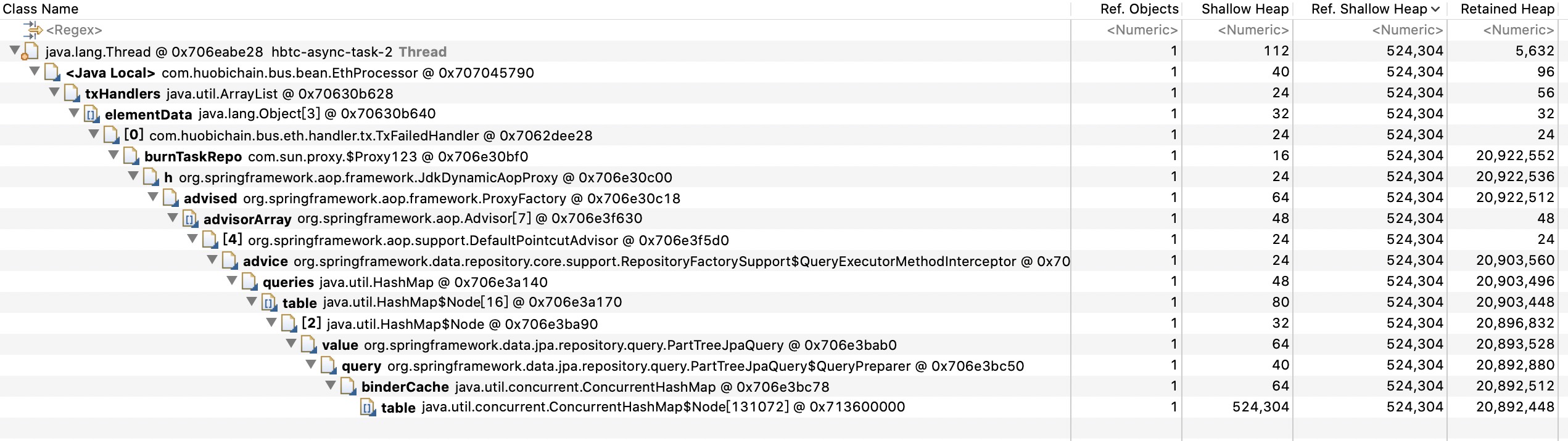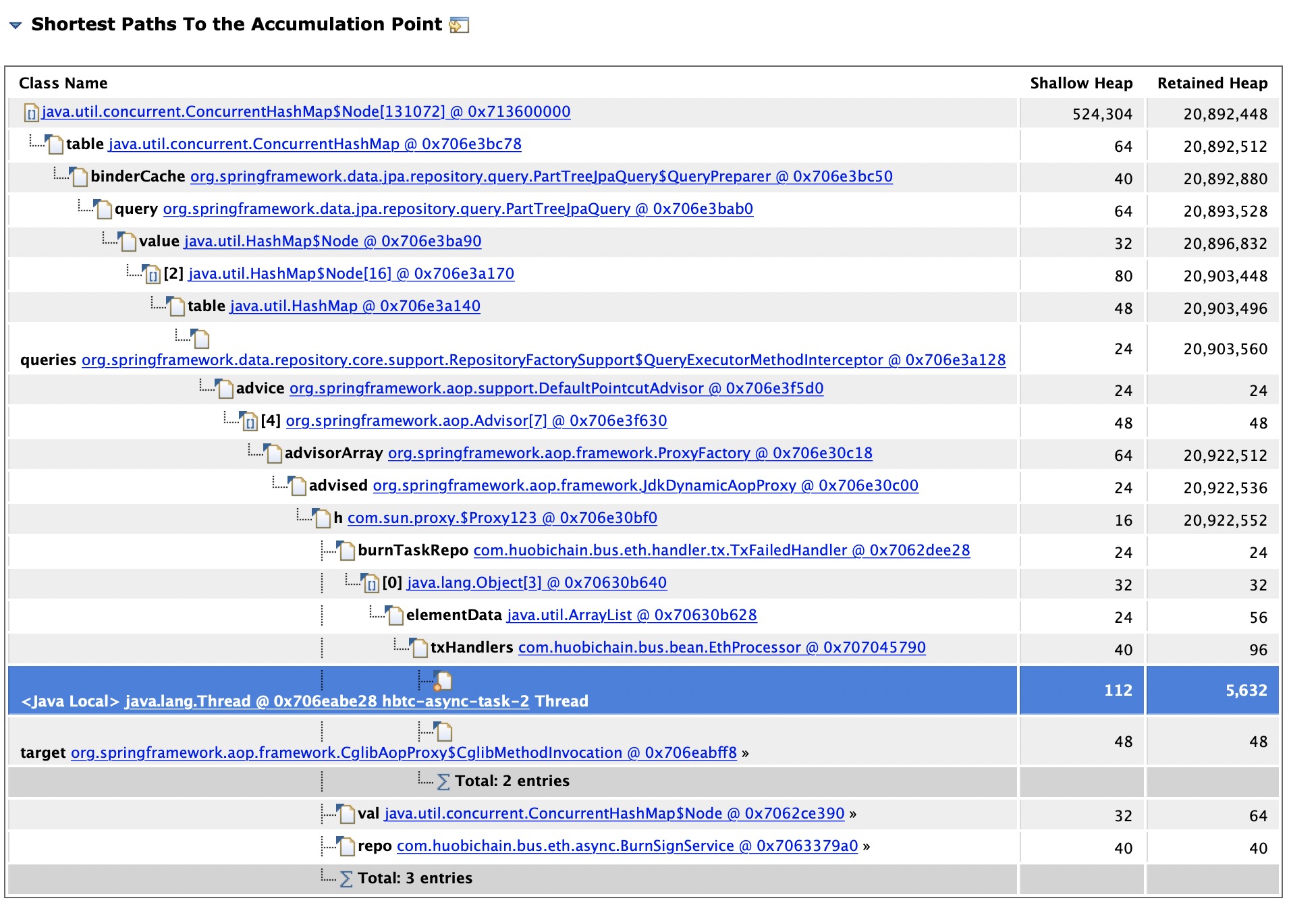 从上到下即为从泄漏源到root的路径,中间因为有分支,看上去不是很清晰,可以通过右键选择Merge Shortest Paths to GC Roots